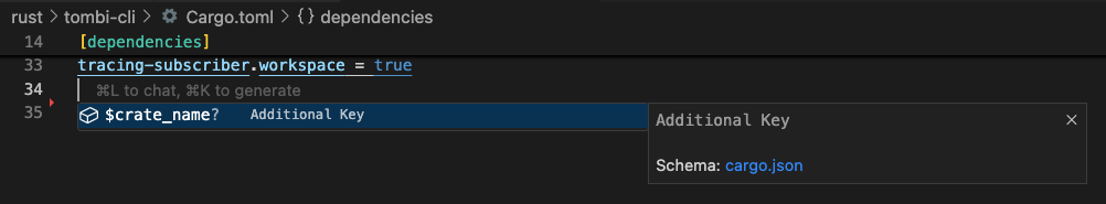 directive in the TOML file's top comment (compatible with Taplo)- JSON Schema specified in the Tombi configuration file